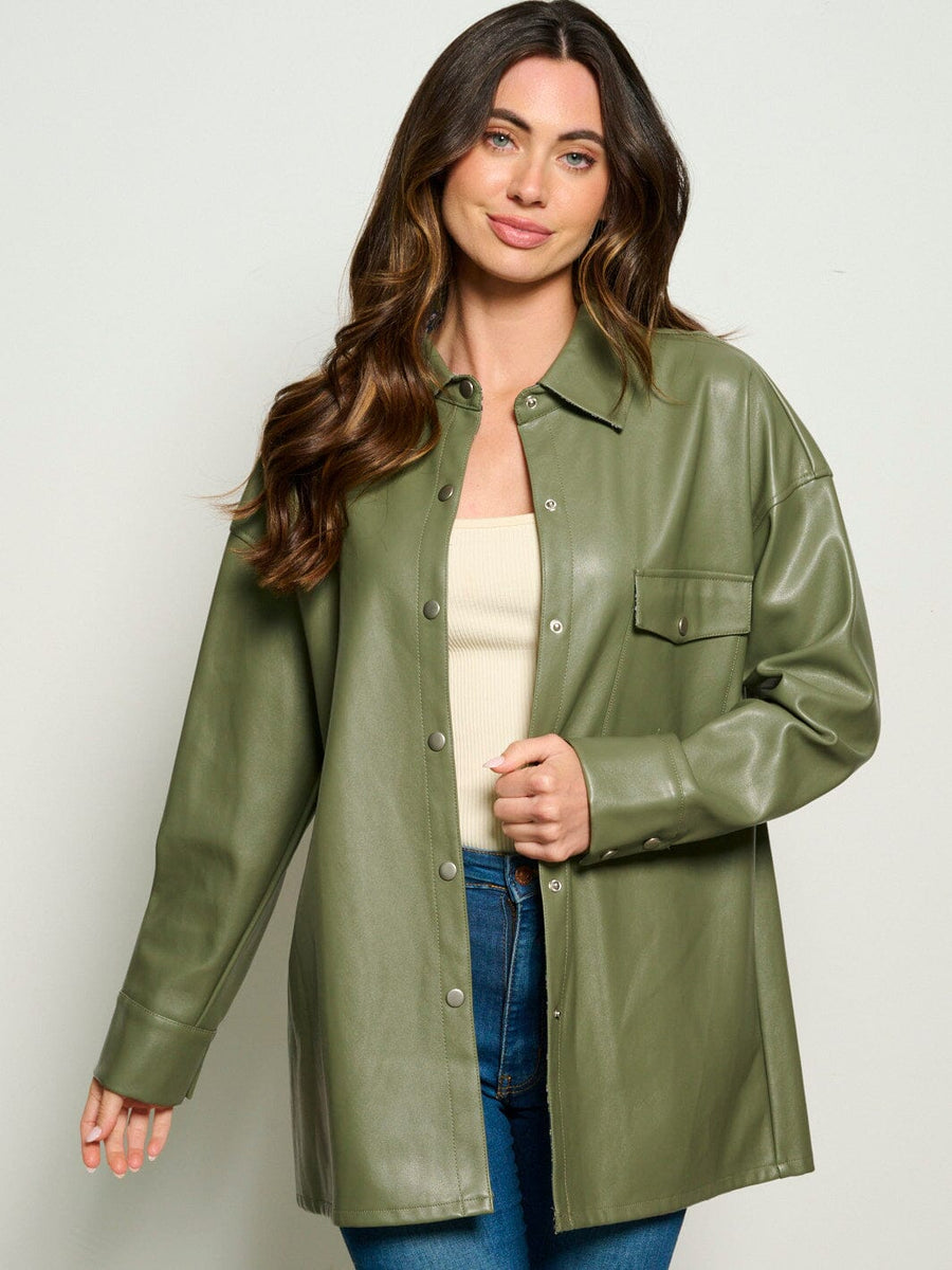 WOMEN'S LONG SLEEVE BUTTON UP PU PLEATHER OVERSIZED TOP